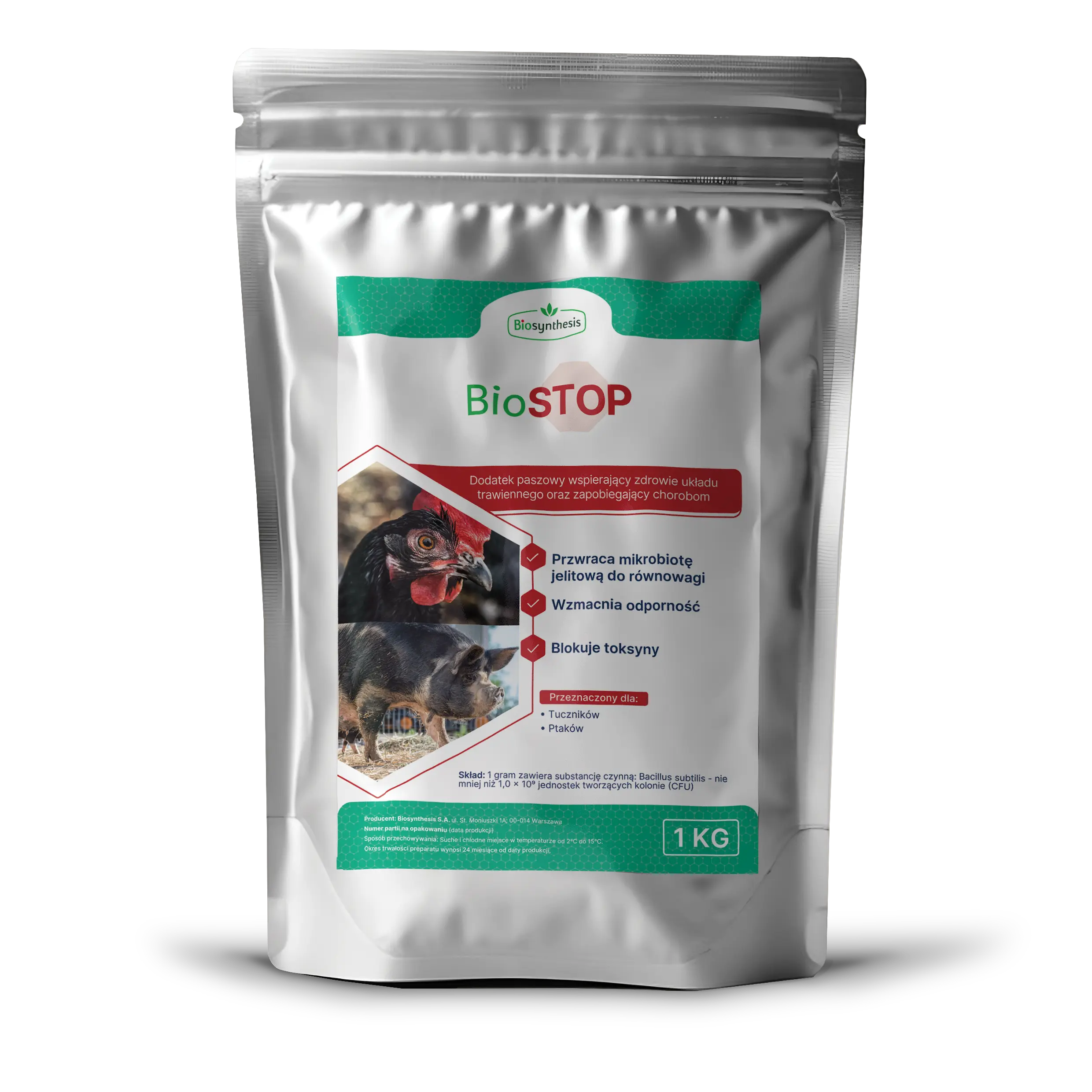 W skład BioStop wchodzą skoncentrowane, wysuszone komórki żywych szczepów Bacillus subtilis. Preparat wykazuje szerokie spektrum aktywności antagonistycznej wobec mikroorganizmów patogennych i warunkowo patogennych podczas chorób ssaków i ptaków. Syntezuje interferon α-2 i posiada aktywność przeciwbakteryjną i przeciwwirusową. Przy doustnym podawaniu BioStop zwiększa nieswoistą odporność organizmu, reguluje i stymuluje procesy trawienne.